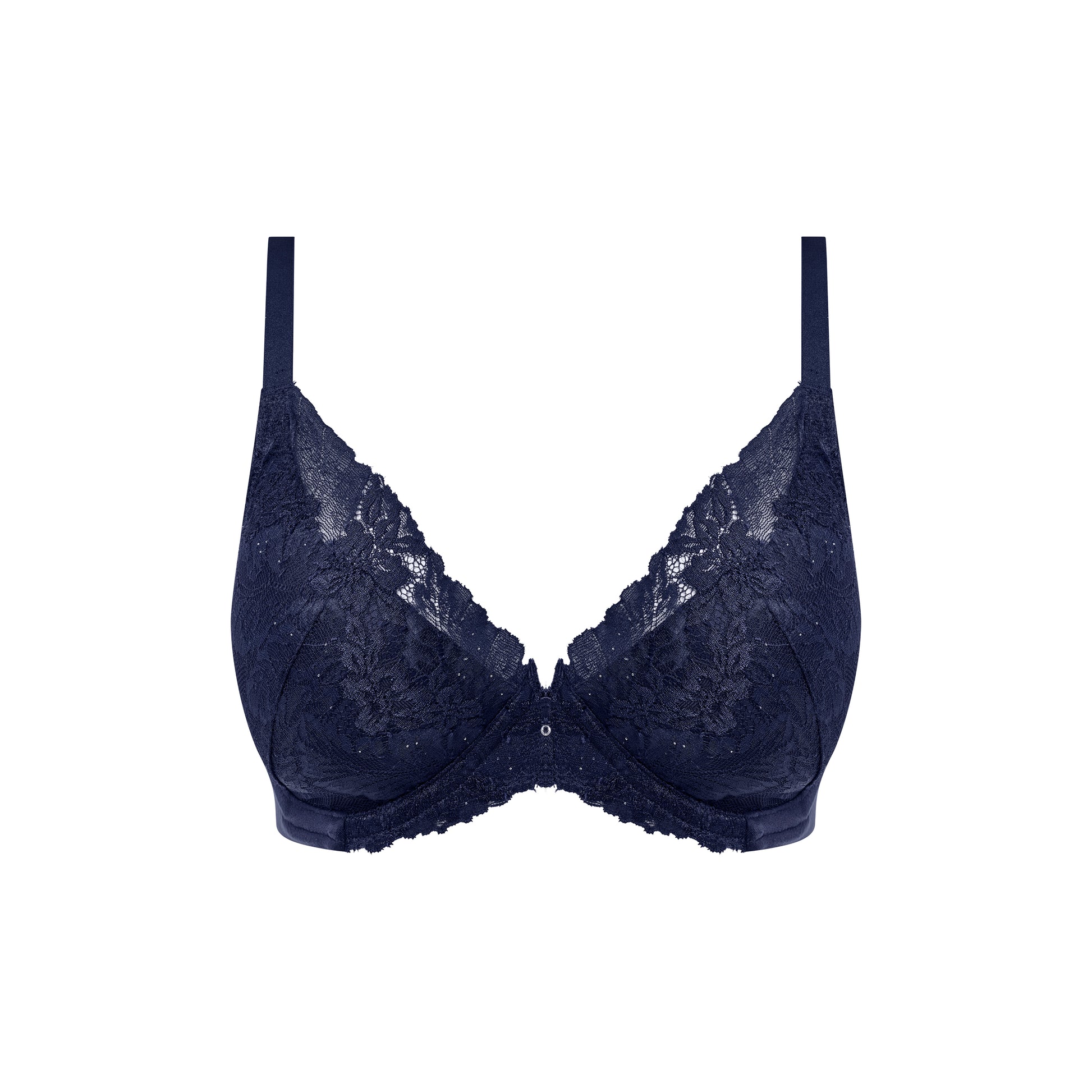 The Wacoal Most Divine Underwire Plunge Bra in navy offers elegant support with delicate lace, smooth cups, and a flattering deep neckline — perfect for creating a naturally lifted, seamless silhouette under any outfit.