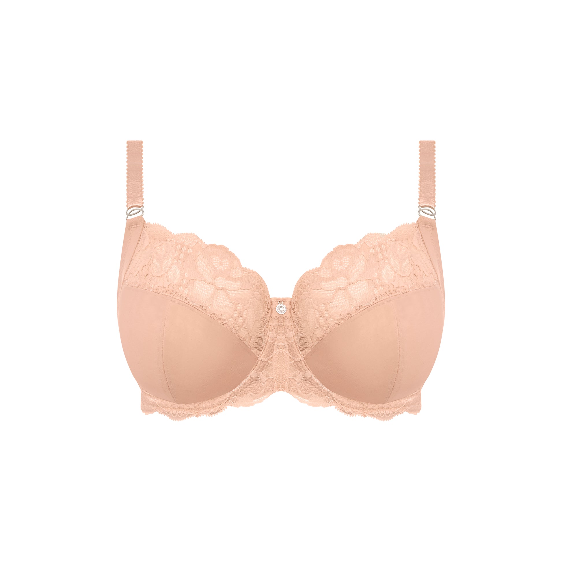 - Three part cup, underwired, side support, hook and eye fastening, adjustable straps